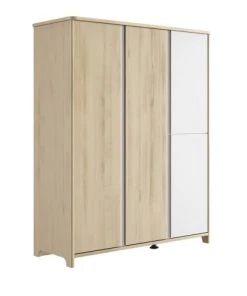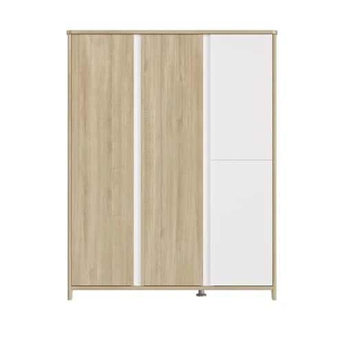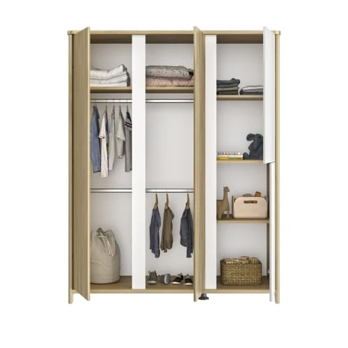 L’armoire 4 portes de la collection Sacha est proposée dans des finitions chêne blond et blanc, dans un style moderne et épuré.