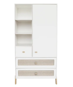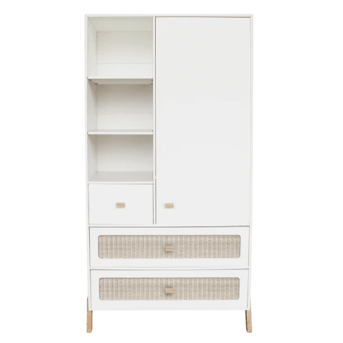 L’armoire 1 porte + 3 tiroirs Marelia blanc neige de la marque Théo est idéale pour allier décoration et rangement. Son style unique apportera une touche de nature à la chambre et la gardera ordonnée. Caractéristiques techniques : – 1 porte avec une penderie et une étagère.- 3 niches.- 1 petit tiroir.- 2 grands tiroirs à glissière.Composition : – Armoire en MDF.- Tressage en rotin sur les grands tiroirs.- Boutons en bois massif.- Pieds en bois massif de cèdre blanc.- Peinture et vernis à base d’eau (sans odeurs ni émanations).