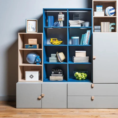 Grâce à la bibliothèque de couleur bleu de la gamme Stige by Vox, le rangement dans la chambre de bébé ne sera plus un problème.Caractéristiques produitMarque: VoxFabrication européenneMatériaux : Mélaminé haut de gammeBibliothèque : 8 casesPoids et dimensions bibliothèque : 44 kg – 94 x 35 x 142 cmConditionnement : produits livrés, à monter, avec notice incluse.Produits Vox garantis 24 Mois.