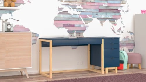 Le bureau d’angle a un grand plateau, deux tiroirs pratiques et un rangement qui offrent beaucoup d’espace de rangement pour les fournitures scolaires.