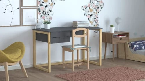 Le bureau est équipé d’un plateau fonctionnel et de deux tiroirs pratiques pour ranger les fournitures scolaires.