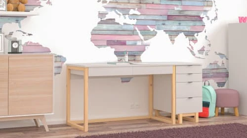 Le bureau d’angle a un grand plateau, deux tiroirs pratiques et un rangement qui offrent beaucoup d’espace de rangement pour les fournitures scolaires.