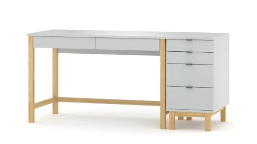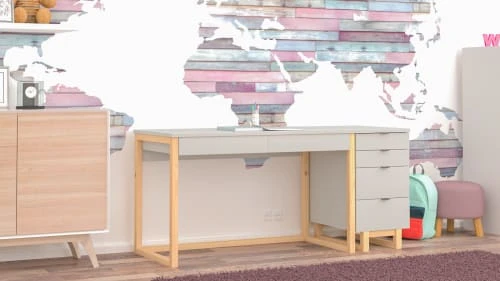Le bureau d’angle a un grand plateau, deux tiroirs pratiques et un rangement qui offrent beaucoup d’espace de rangement pour les fournitures scolaires.