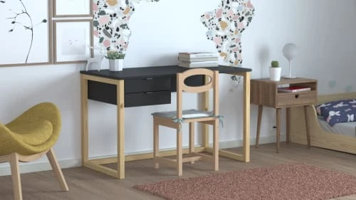 Le bureau est équipé d’un plateau fonctionnel et de deux tiroirs pratiques pour ranger les fournitures scolaires.