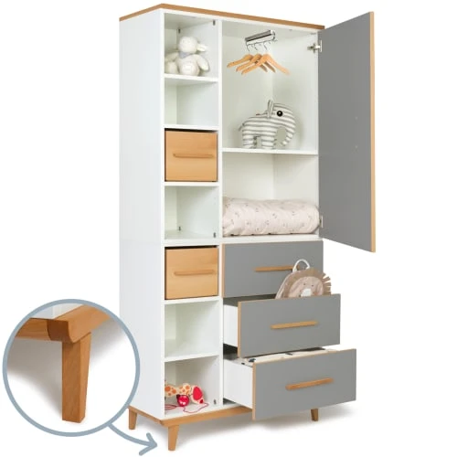 Grâce à ses 7 niches qui peuvent accueillir des cubes de rangement en bois massif (vendus séparément), sa tringle à vêtements coulissante, sa grande étagère et ses 3 tiroirs, elle est très fonctionnelle ! De plus, le système de fermeture “Soft Close”, doux et silencieux, assure un maximum de confort et de sécurité.