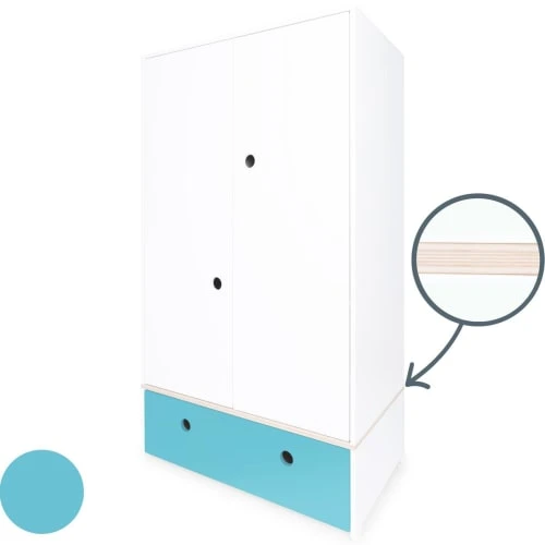 L’armoire enfant 2 portes COLORFLEX est équipée de deux grandes portes et d’un tiroir, séparés par une planche de contreplaqué de bouleau. Le système de fermeture “Soft Close”, doux et silencieux, assure un maximum de confort et de sécurité.