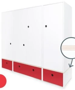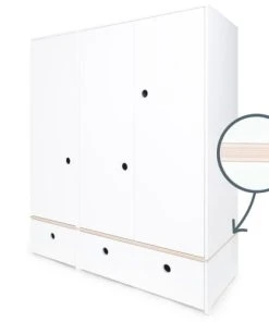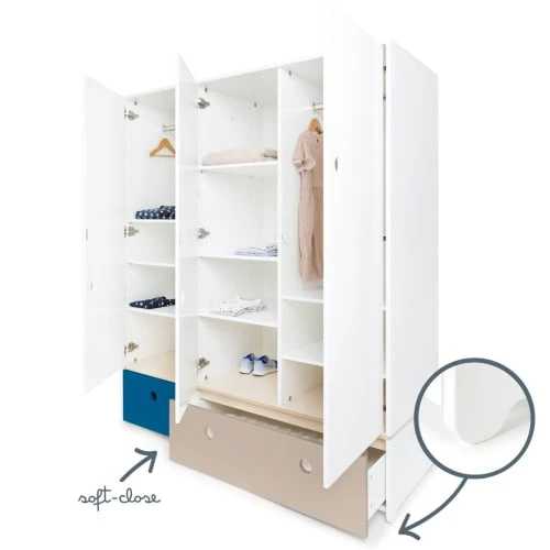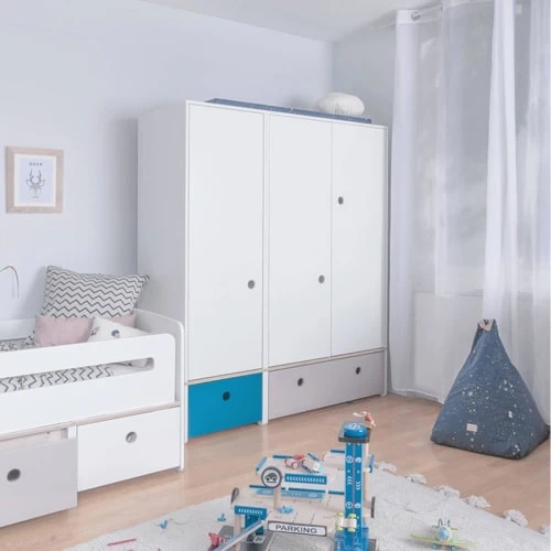 L’armoire enfant 3 portes COLORFLEX est équipée de 3 grandes portes et de 2 tiroirs, séparés par une planche de contreplaqué de bouleau. Le système de fermeture “Soft Close”, doux et silencieux, assure un maximum de confort et de sécurité.