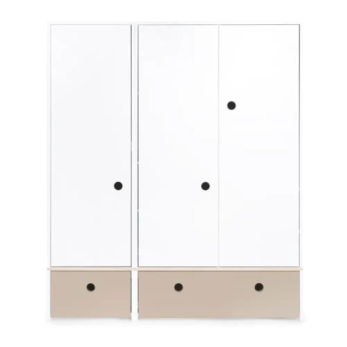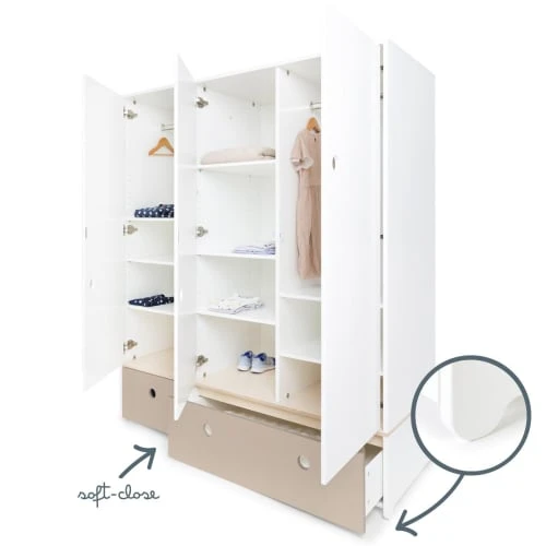 L’armoire enfant 3 portes COLORFLEX est équipée de 3 grandes portes et de 2 tiroirs, séparés par une planche de contreplaqué de bouleau. Le système de fermeture “Soft Close”, doux et silencieux, assure un maximum de confort et de sécurité.
