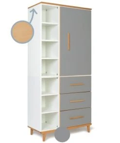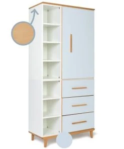 L’armoire enfant 3 portes est vendue avec 8 étagères réglables en hauteur et 2 tringles. Le sens d’ouverture des portes est au choix : gauche ou droite. Pour les poignées, deux positions possibles : basse ou haute.