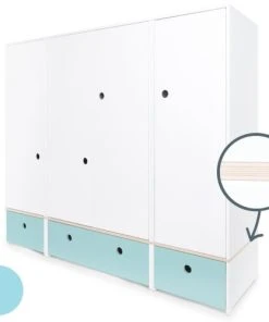L’armoire enfant 3 portes COLORFLEX est équipée de 3 grandes portes et de 2 tiroirs, séparés par une planche de contreplaqué de bouleau. Le système de fermeture “Soft Close”, doux et silencieux, assure un maximum de confort et de sécurité.
