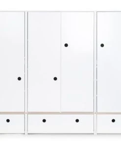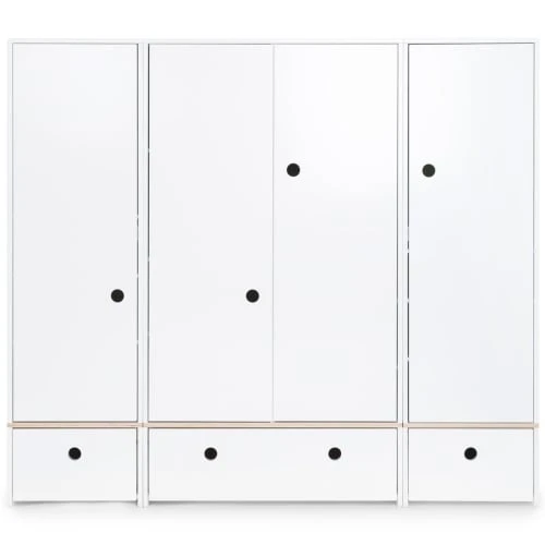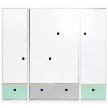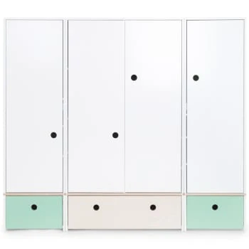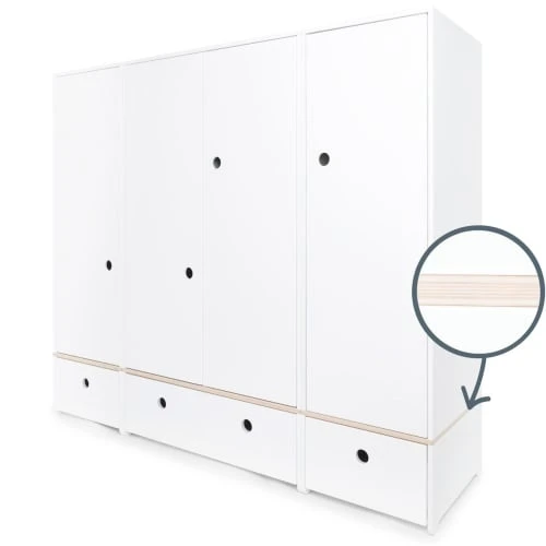 L’armoire enfant 4 portes COLORFLEX est équipée de 4 grandes portes et de 3 tiroirs, séparés par une planche de contreplaqué de bouleau. Le système de fermeture “Soft Close”, doux et silencieux, assure un maximum de confort et de sécurité.