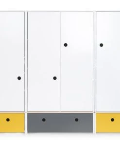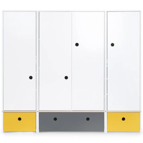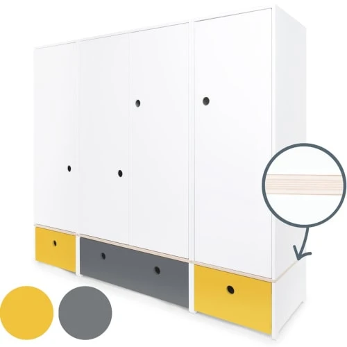 L’armoire enfant 4 portes COLORFLEX est équipée de 4 grandes portes et de 3 tiroirs, séparés par une planche de contreplaqué de bouleau. Le système de fermeture “Soft Close”, doux et silencieux, assure un maximum de confort et de sécurité.