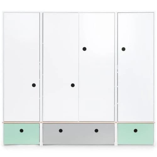 L’armoire enfant 4 portes COLORFLEX est équipée de 4 grandes portes et de 3 tiroirs, séparés par une planche de contreplaqué de bouleau. Le système de fermeture “Soft Close”, doux et silencieux, assure un maximum de confort et de sécurité.